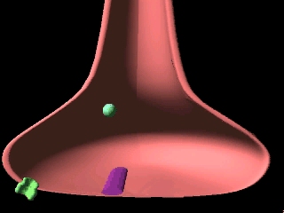 The first step in this process involves freeing the neurotransmitter-containing vesicles from the bonds that hold them to the cytoskeleton. The vesicles are then free to travel to the active zones, where docking takes place. Docking is the process by which the vesicle and the pre-synaptic membrane line up in a position that will allow them to fuse easily. Fusion then takes place, in which the vesicle membrane and the pre-synaptic membrane connect to form a small opening, a pore, connecting the lumen of the vesicle with the synaptic cleft. This pore grows larger and larger until the vesicle membrane collapses into the pre-synaptic membrane and releases its contents into the synaptic cleft, a process called exocytosis.